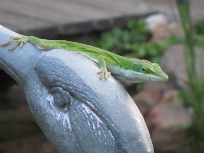 is for the acrobatic Anole that hangs out on the head of my "peacock crane." I love watching his antics as he sits on his perch above the pond.