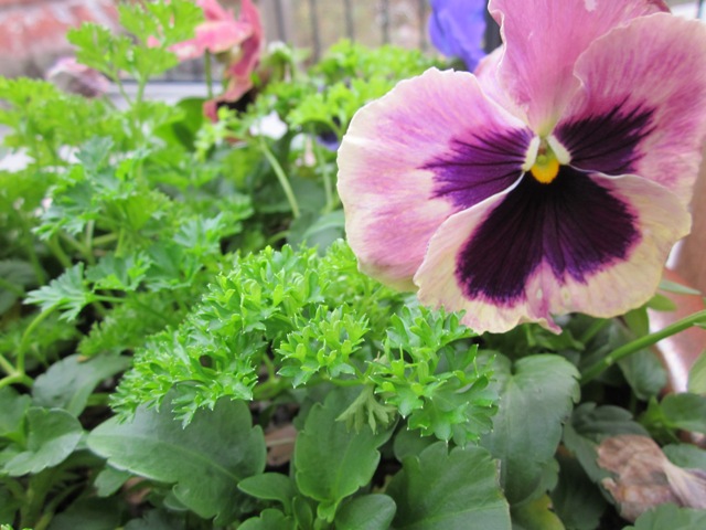 A new pansy companion in my containers is bok choy. I am not sure how it would do if it got down into the low 20s or teens, but in the high 20s and low 30s, it has done great. I hope to use more of this next year.